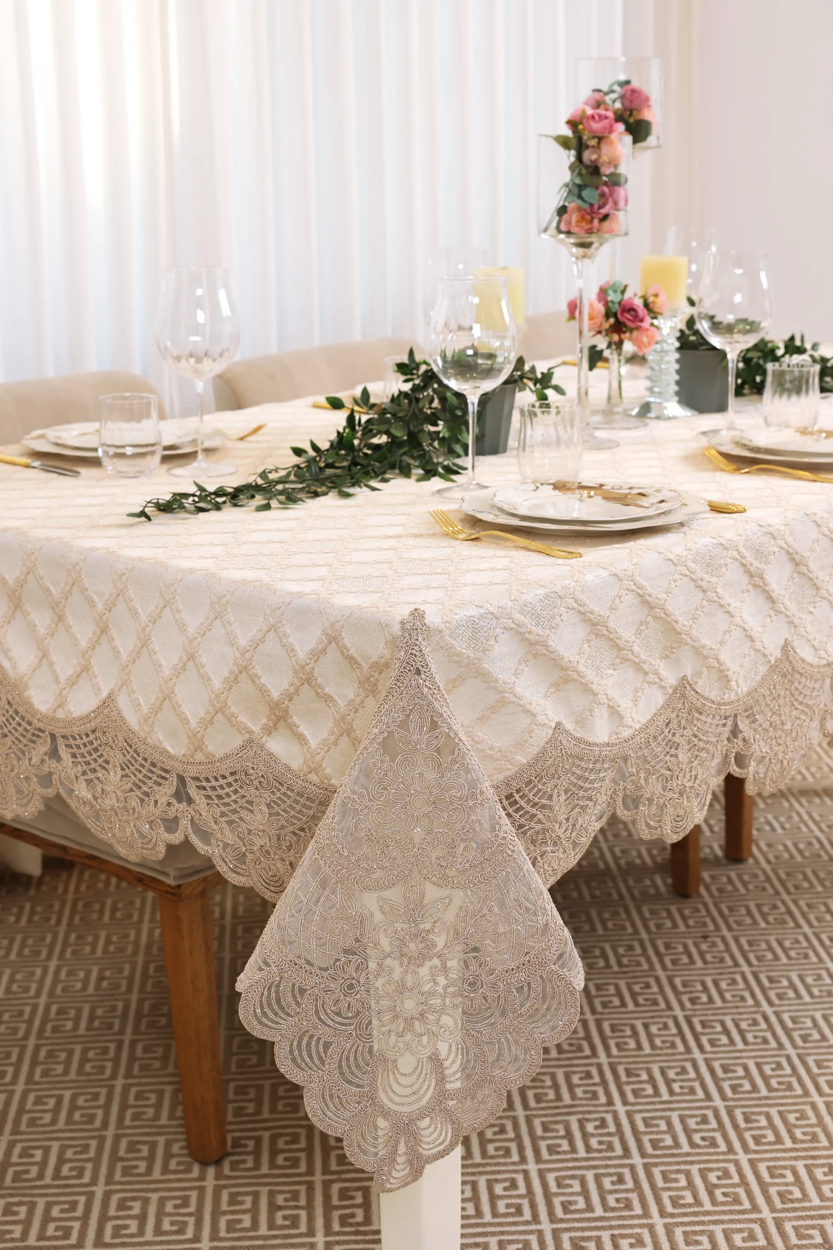 מפות שולחן אלגנטיות במיוחד, העשויות מבד ג'קארד יוקרתי ששזור בחוטי לורקס. המפות מעוטרות בתחרה רקמה מלכותית ויוצרות מראה יוקרתי לשולחן ולחדר האוכל. המפות הן דוחות כתמים ועמידות לכביסות רבות.